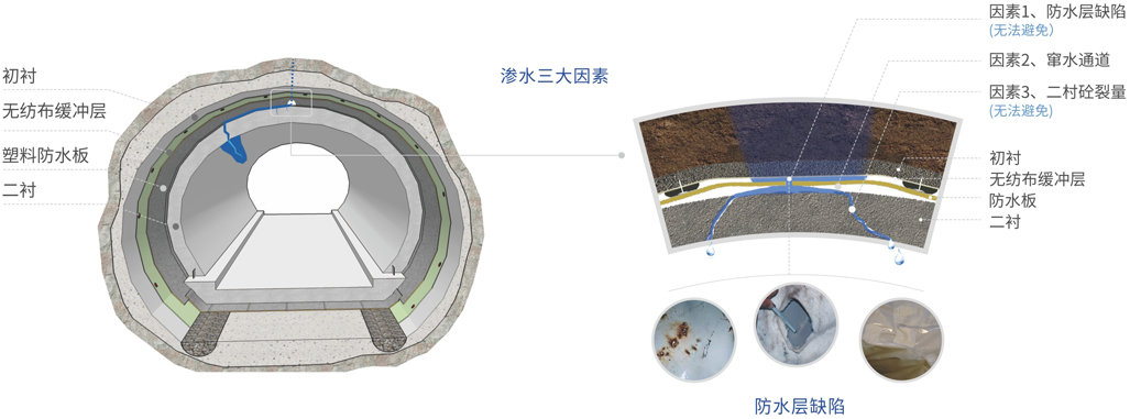 塑料防水板与后续浇筑的二衬混凝土结构不粘结,易窜水,加上难以避免的瑕疵(搭接漏焊、破损等),都会导致防水层与二衬混凝士之间大面积存水,甚至导致防水效果整体丧失。