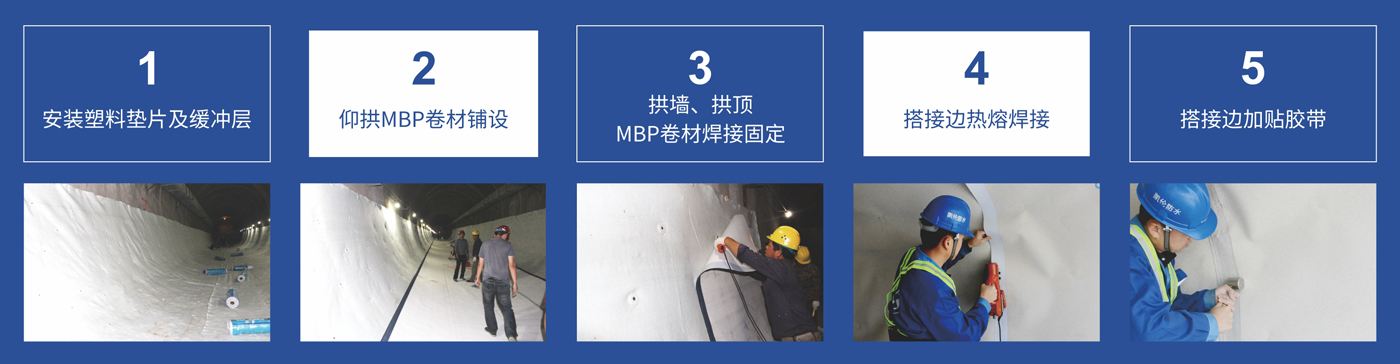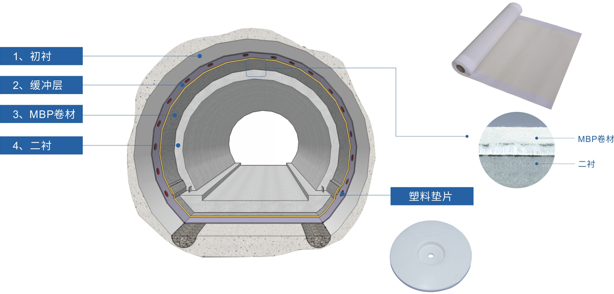 MBP卷材和后浇筑二树混凝土两者的牢固粘结,能有效消除窜水,即使防水层出现薄弱点,水也会被锁死在这一点,不易渗漏,也不会在防水层和二衬混凝土士之间窜流;而结构有裂缝的地方,只要防水层在此部位完好,也不会渗漏。换言之,刚柔两道构造层相互弥补各自可能存在的缺陷,相得益彰,相互呵护。
